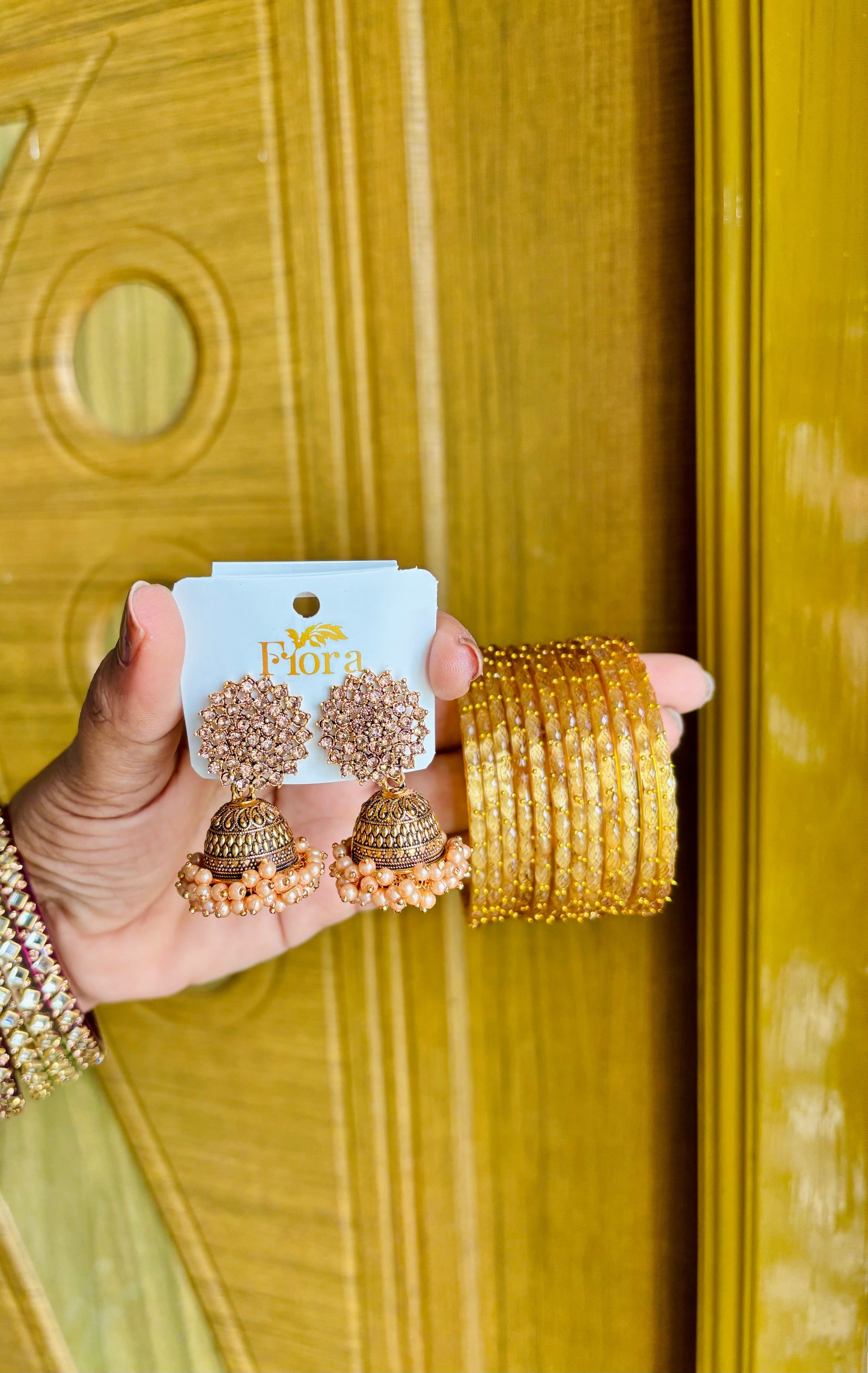 1 set of jhumka + 1 dozen gold raindrops crystal