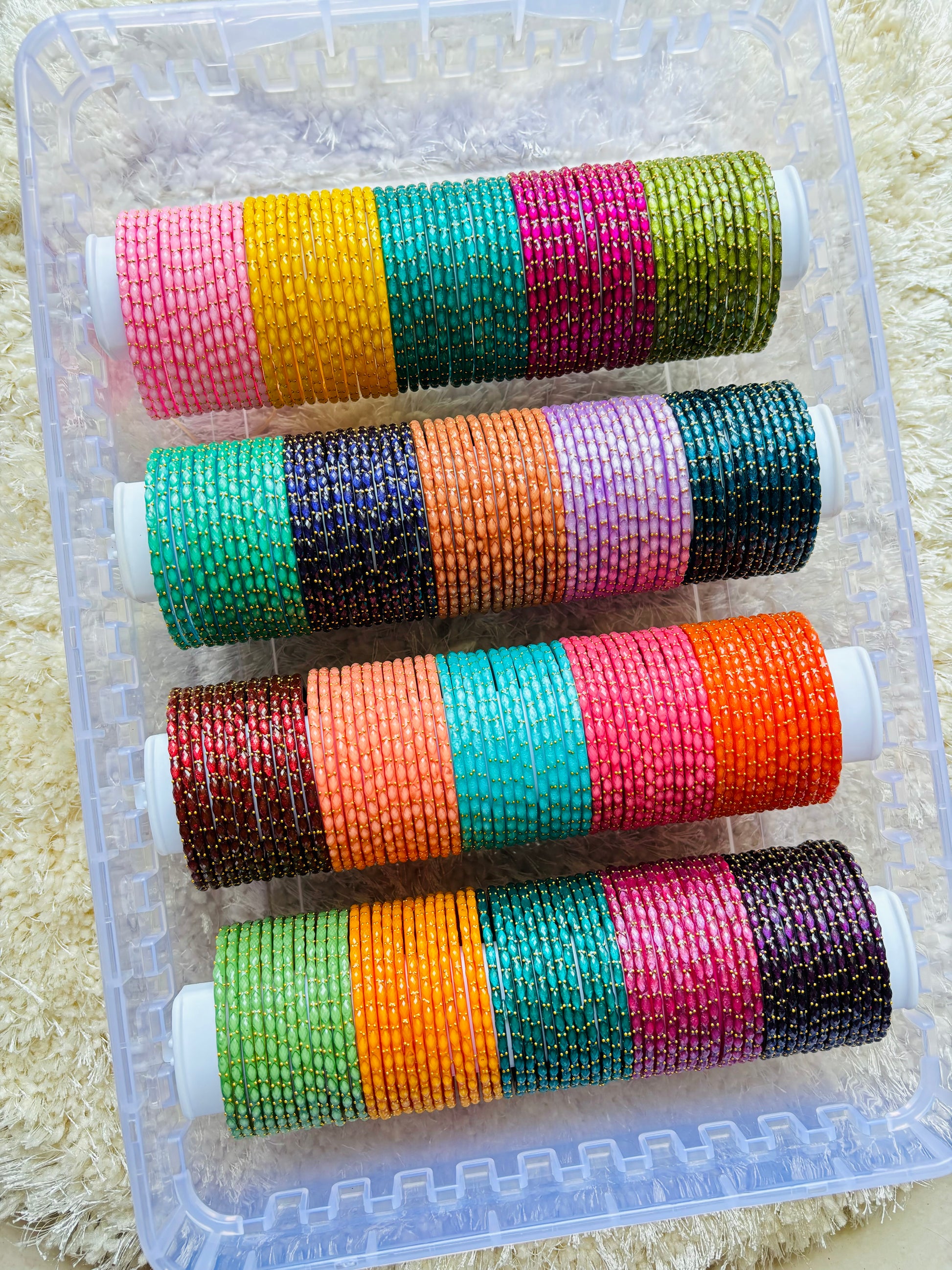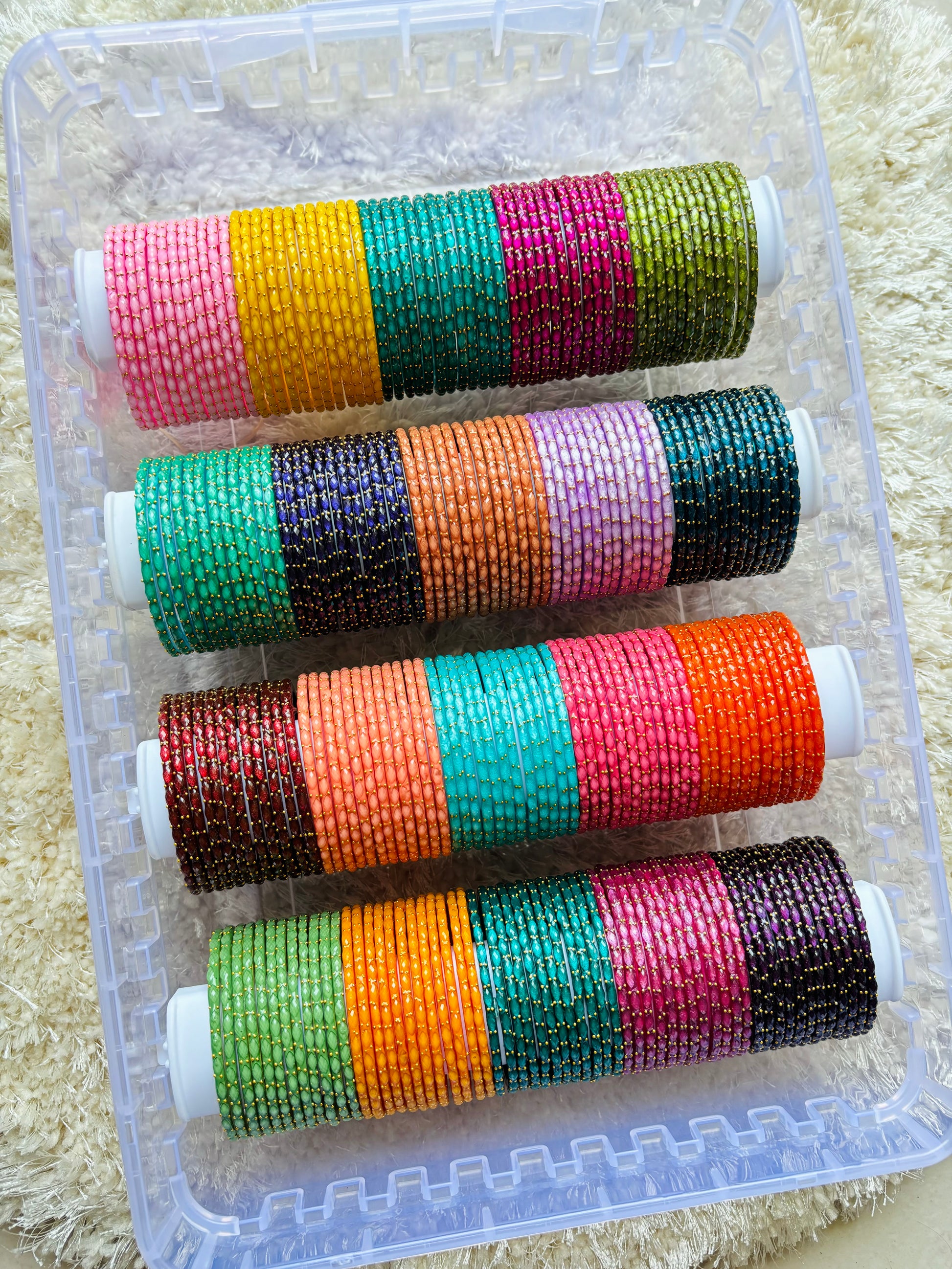 This combo contains 20 dozens of raindrop crystal bangles with the 4rod storage box